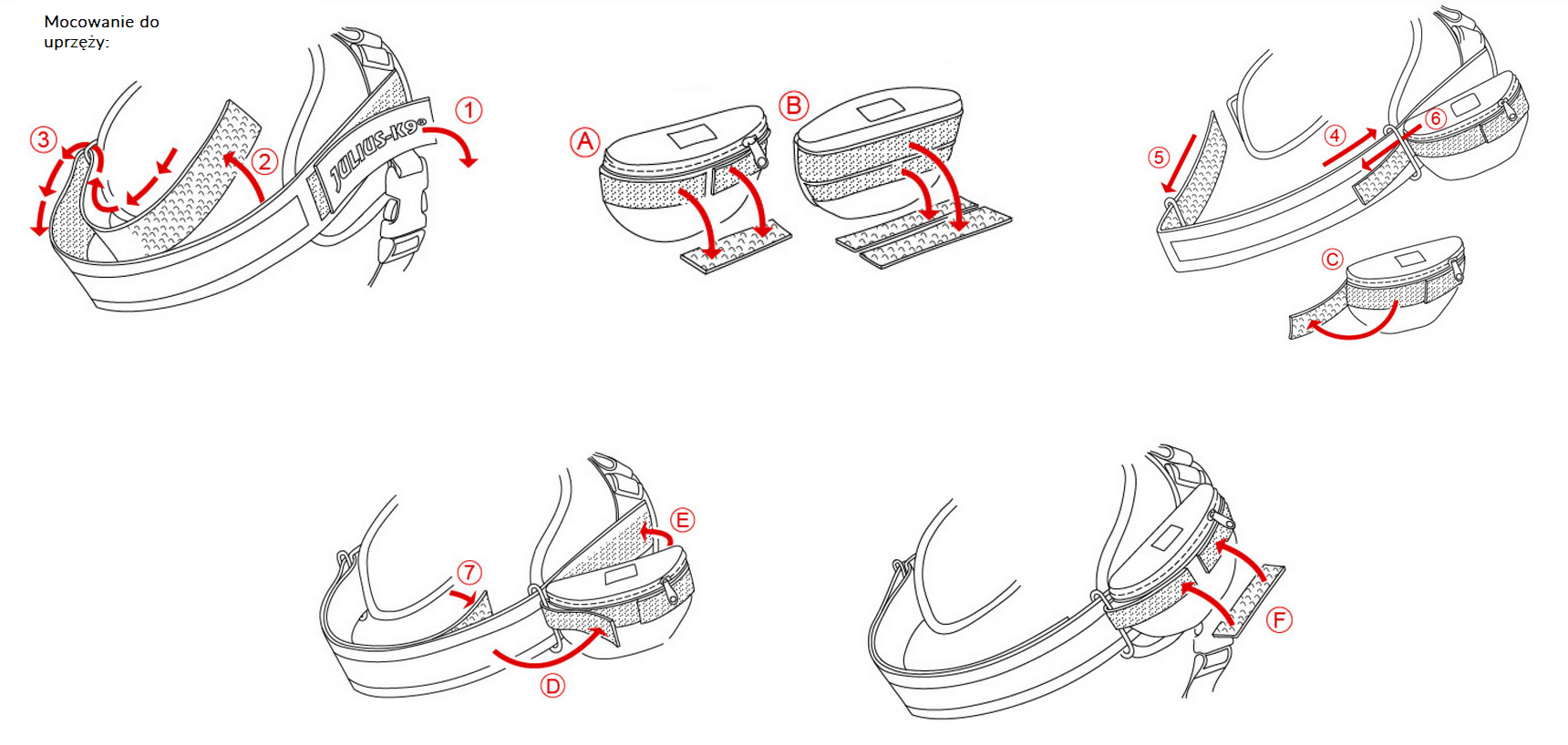 W przypadku pasa do biegania Premium sakiewkę montuje się na pas z tylu. W przypadku odzieży opiekuna sugerujemy montaż na pas od spodni.